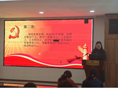 大会第一项是集体奏唱中华人民共和国国歌,全体参会人员庄严肃立,高唱义勇军进行曲。大会第二项,2025届研究生党支部委员会委员蒋鸿杰对研究生党支部的整体情况进行全面介绍。她提到,我院研究生党支部共分为3个支部,党员总数为71人,其中一支部19人,二支部22人,三支部30人,其中在2025年度共接收预备党员13人,预备党员按时转正10人,延时转正0人。