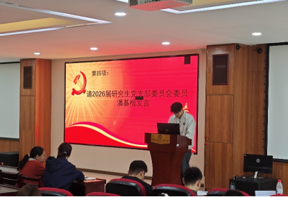 接下来是电子信息学院2026年新当选的研究生党支部委员会委员潘基楷发言,他强调党支部对学院和学生发展具有重要作用,并对即将开展的工作做出初步安排。随后2026届研究生党支部各支部其他书记也依次上台,就如何加强支部建设、提升党员素质等问题分享了自己的想法和计划。
