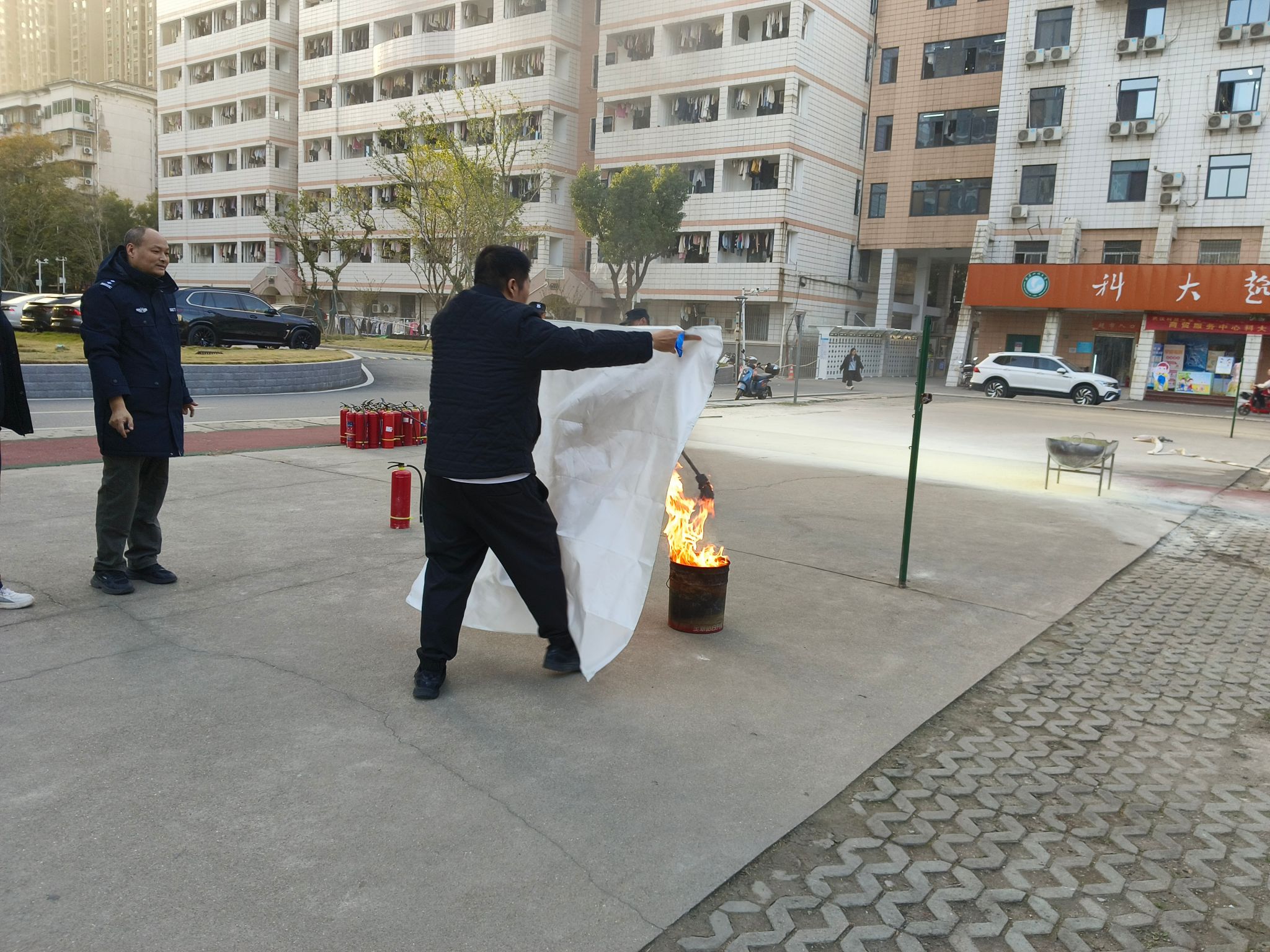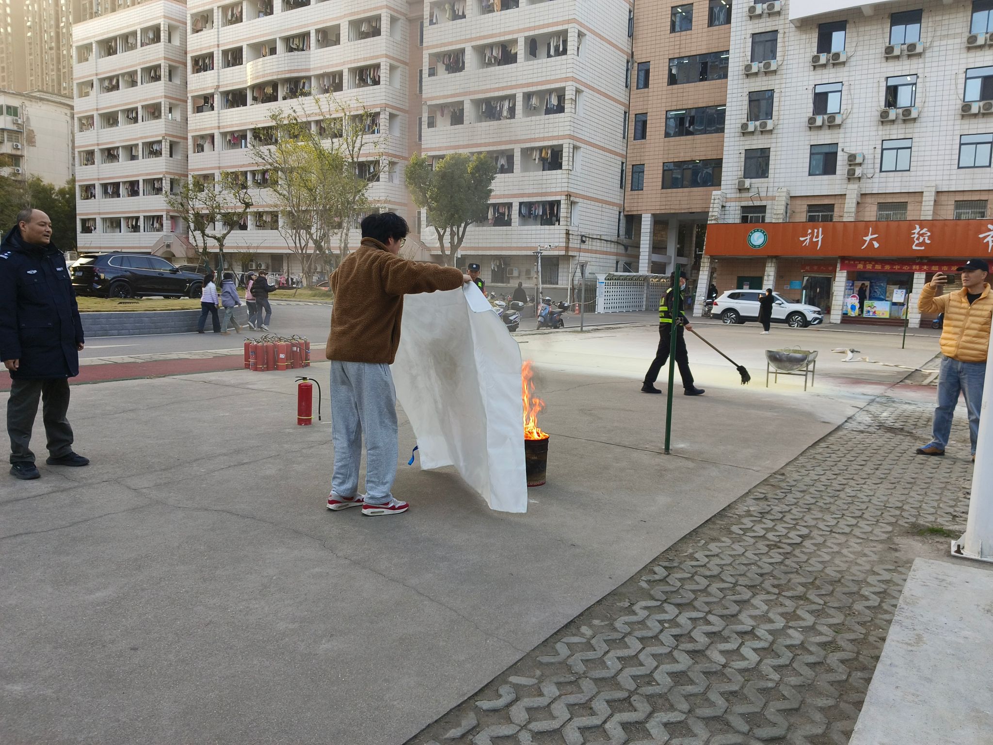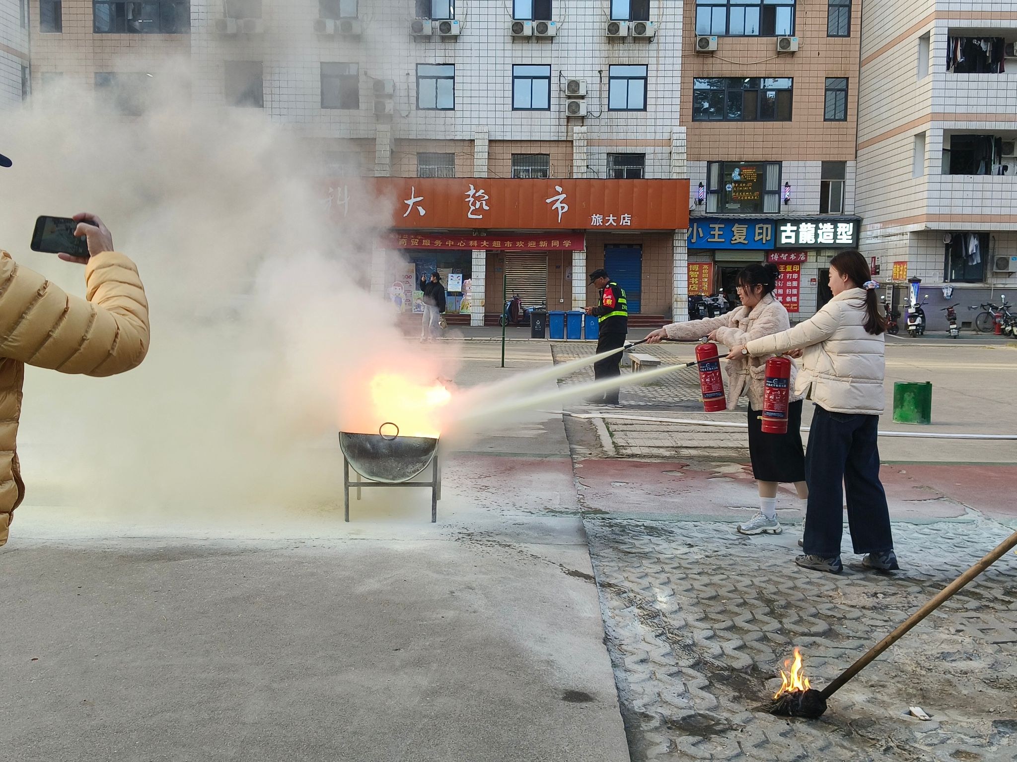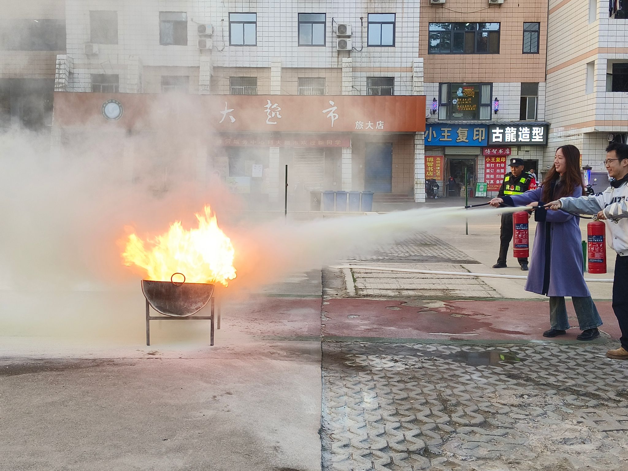 疏散集结完毕后,师生们移步至消防演练区,进入演练的第二阶段——消防器材实操培训。保卫处专业人员详细讲解并演示了干粉灭火器的正确使用方法,精炼概括为“提、拔、握、压”四个步骤,并辅以“提拔我呀”的谐音梗帮助记忆,生动形象。在随后进行的实操环节中,师生们积极参与,两人一组,提着灭火器,轮番上阵,面对点燃的油桶火焰,沉着冷静地按照操作要领成功将火扑灭,亲身体验了初期火灾的扑救过程。