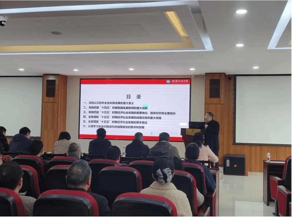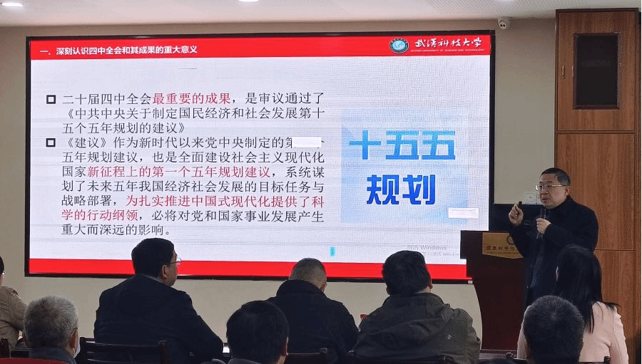 会上,张齐武教授以《从“十四五”成就到“十五五”蓝图 接续推进中国式现代化》为题,围绕深入学习领会全会精神、回顾“十四五”发展成就、解读“十五五”规划部署、践行使命担当助力现代化等四个方面,进行了系统阐释和深入解读。他结合学校发展和学科实际,强调要把全会精神转化为育人实践的导向、科研攻关的动力,引导师生在筑牢信仰之基中把准前行方向。