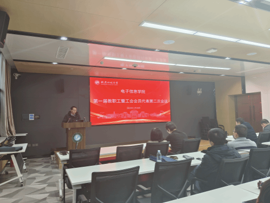 1月19日,电子信息学院第一届教职工暨工会会员代表大会第二次会议在青山校区图书馆路演厅召开。院领导班子、双代会代表及列席代表参会,会议总结2025年工作、部署2026年任务,依法履职、凝聚共识,分工会主席吴广良主持会议。