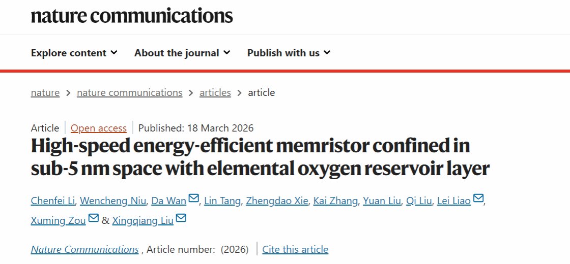 我院万达副教授团队与湖南大学半导体学院廖蕾教授团队合作,在《Nature Communications》发表了题为“High-speed energy-efficient memristor confined in sub-5 nm space with elemental oxygen reservoir layer”的论文。我校2021级硕士生李晨飞为论文第一作者,万达副教授为论文通讯作者,我校为论文第一完成单位。